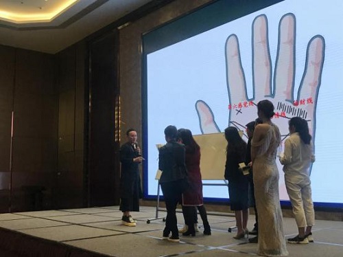 讲座开始,秦阳明老师通过手相开场来拉近和嘉宾们的关系,推进讲座的进行。秦老师教大家看手相先以掌面为中心,通过上面的大小纹路走向及上面的分支符号和掌面上下左中右的部位来分析其人的天赋、性格、成就,祖上贫富、父母、配偶、子女情况及自己发展的趋势。